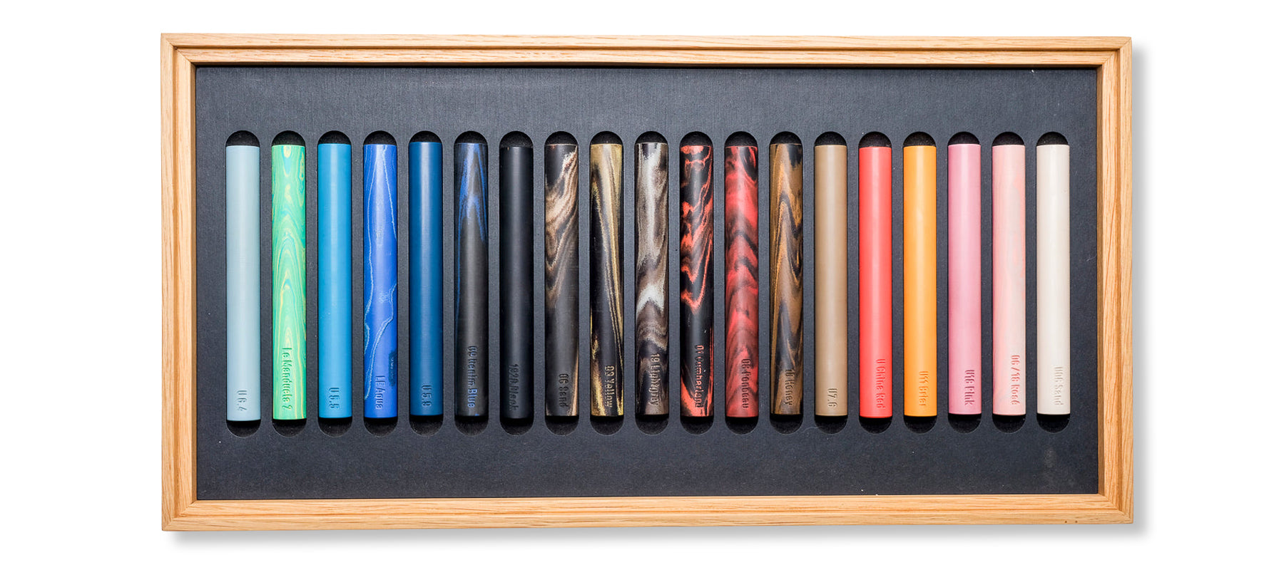 Mit diesen Einzelanfertigungen erfüllt ELBWOOD auch die ausgefallensten Materialwünsche seiner Kunden. Seltene Hölzer, Ebonit und kostbare Materialien wie Silber, Gold oder Mokume Gane – exklusive Werkstoffe für luxuriöse Füllfederhalter, Kugelschreiber und Bleistifte mit Sammlerwert.