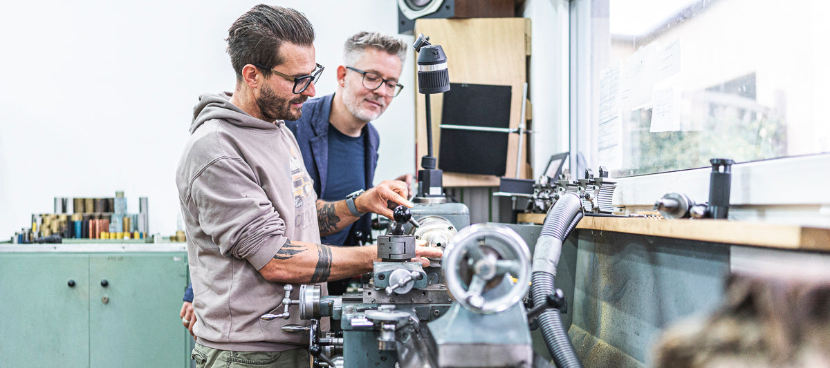Frank Pressentin begleitet und unterstützt den handwerklichen Fertigungsprozess und leitet an den Maschinen an. Dabei hat er ein offenes Ohr für die Geschichten, die das Leben schreibt.