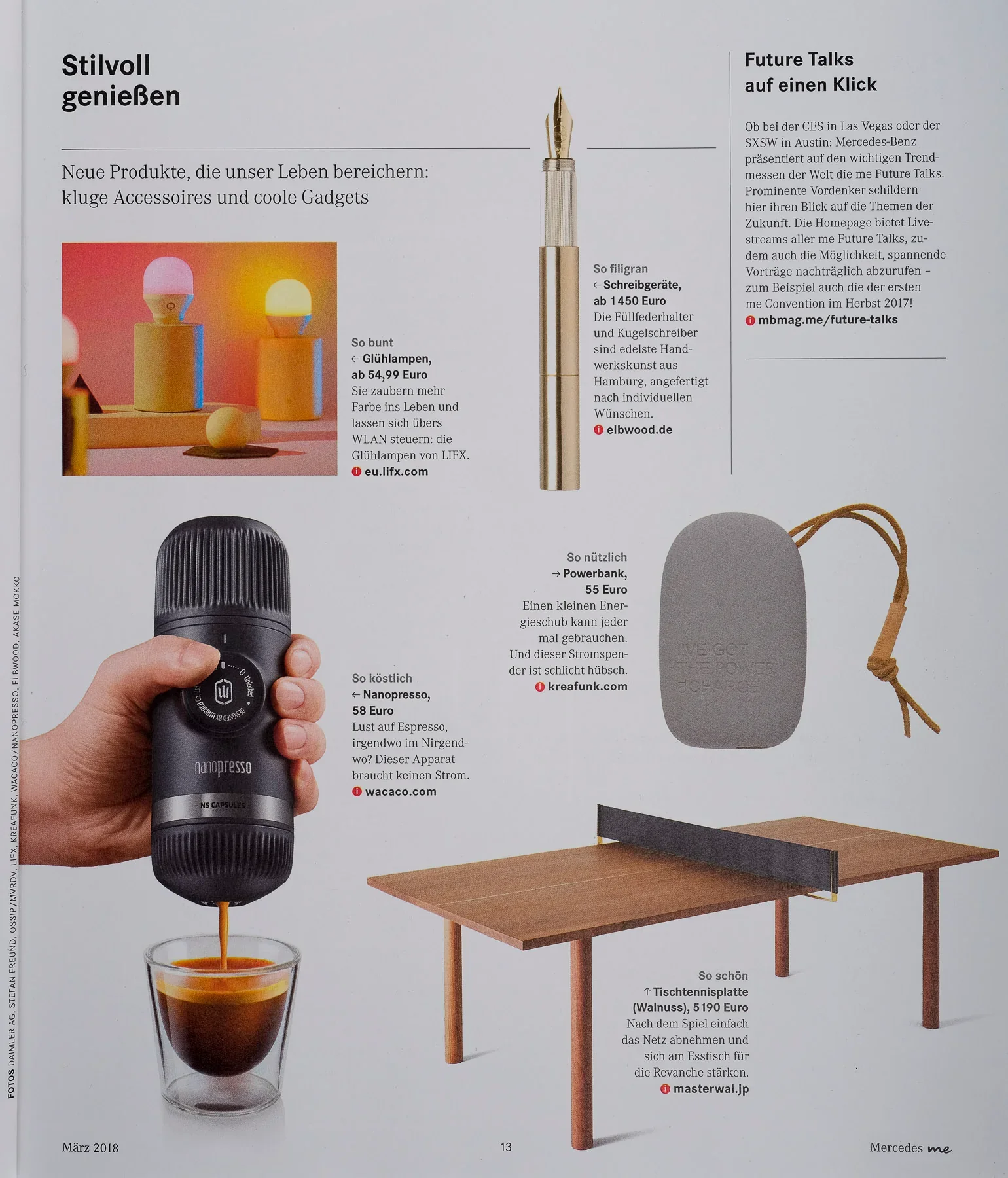 PRESSEZITAT: Das MERCEDES ME-MAGAZIN präsentiert in seiner aktuellen Ausgabe 01-2018 den Taschenfüllfederhalter von ELBWOOD.