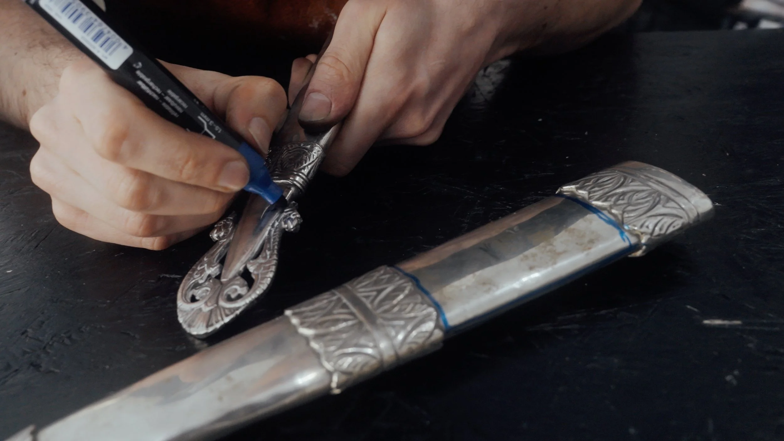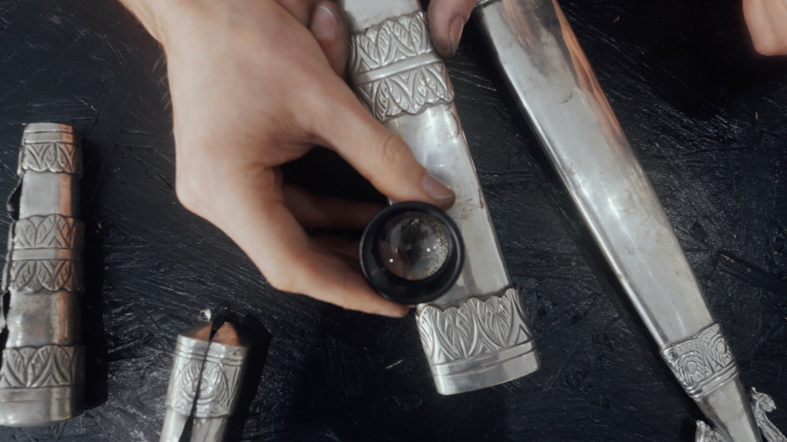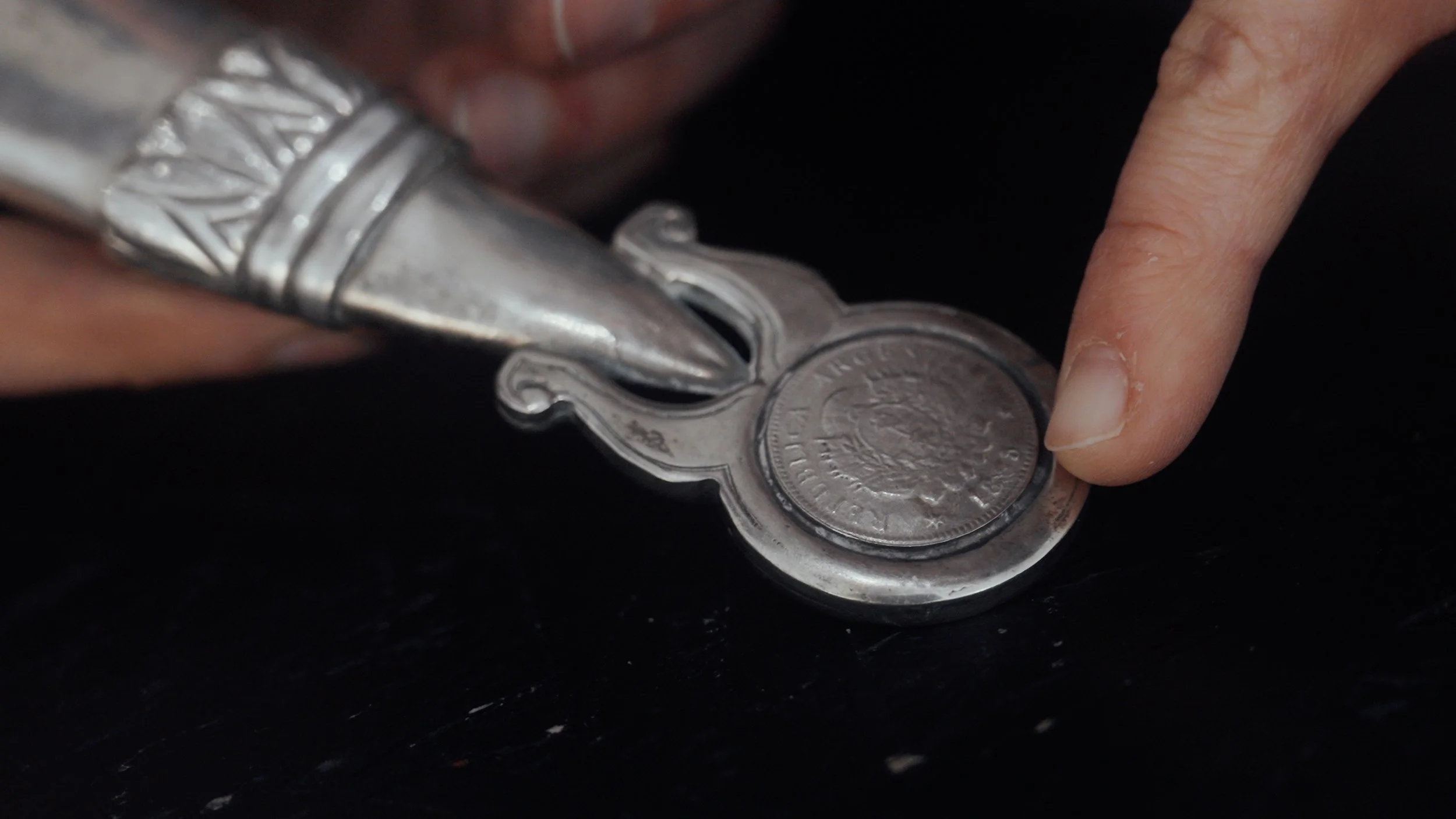 Für den Schaft wählte ich massives 935er Silber – eine bewusste Verneigung vor Argentinien, dessen Name sich vom lateinischen argentum für Silber ableitet, und ein stiller Verweis auf die Landesgeschichte. Das Griffstück bewahrt die archaische Oberfläche des Sandgusses – ein bewusstes Zitat der rauen, ungezähmten Welt der Gauchos. Die Kappe schließlich wurde dem renommierten Hamburger Handgraveur Florian Güllert anvertraut. Mit außergewöhnlicher Präzision übertrug er die historischen Gravuren der Gauchos auf das Metall, als würde er eine Geschichte in Silber erzählen.
