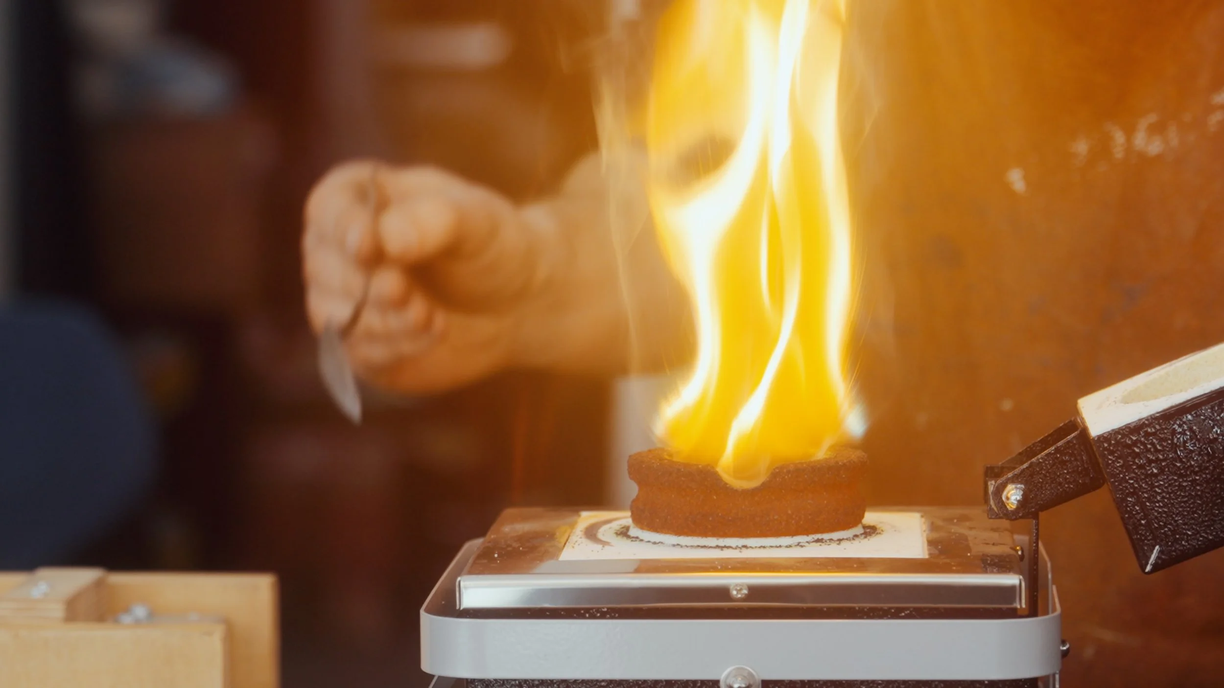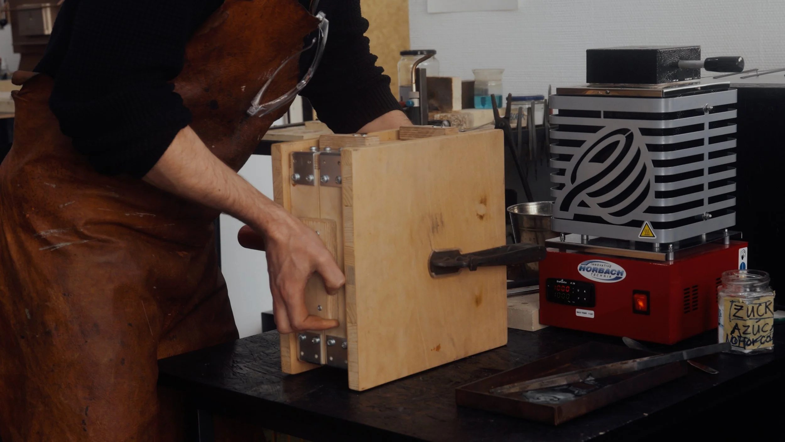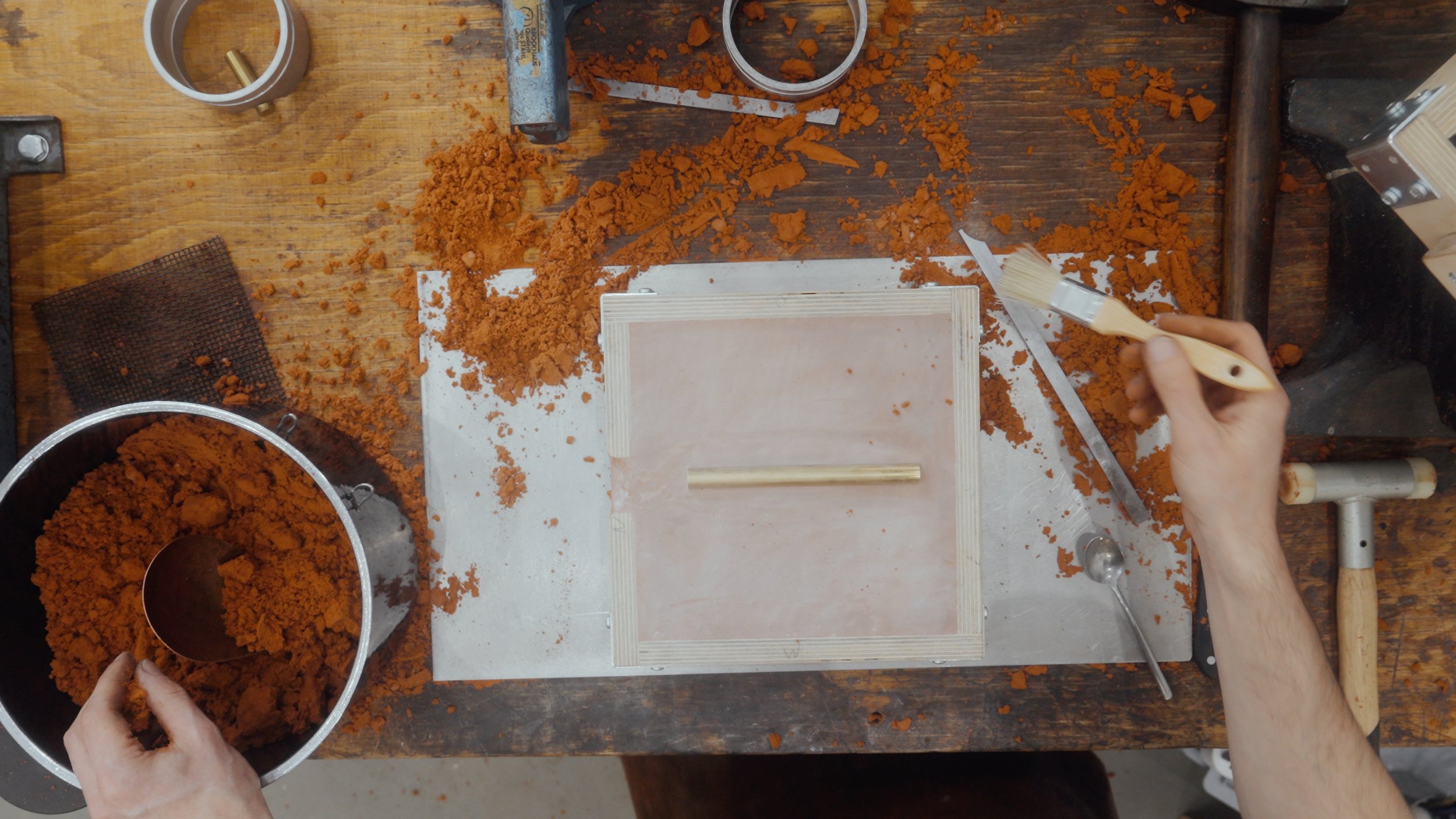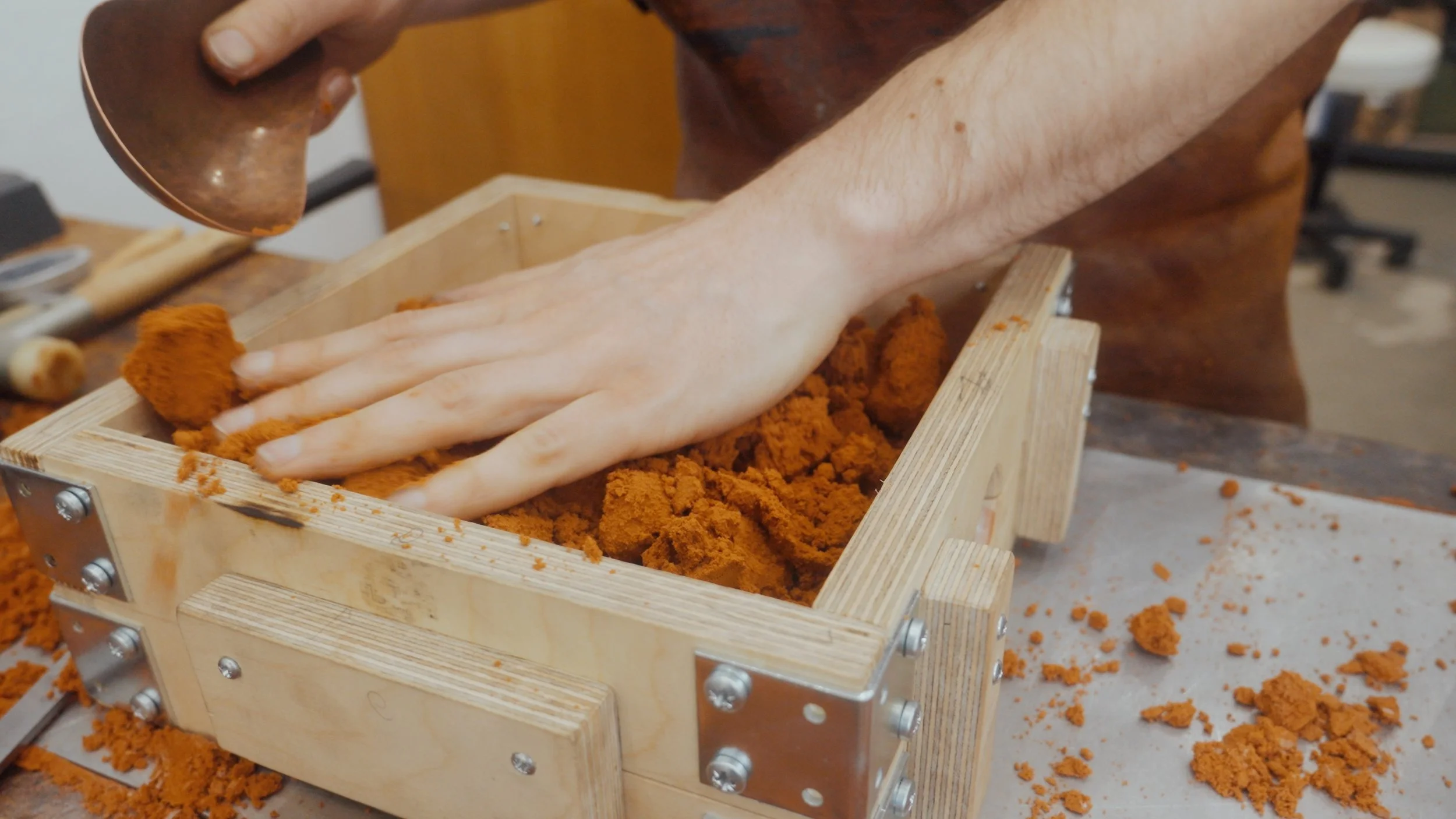 Mit den Messern fuhr ich ins Studio Nonne 11 nach Bamberg, um mit Alvaro-Luca Ellwart zusammenzuarbeiten. Er ist spezialisiert auf das Einschmelzen von Metallen und das archaische Sandgussverfahren in Delfter Sand – ein konzentrierter, alchemistischer Umgang mit dem Material.