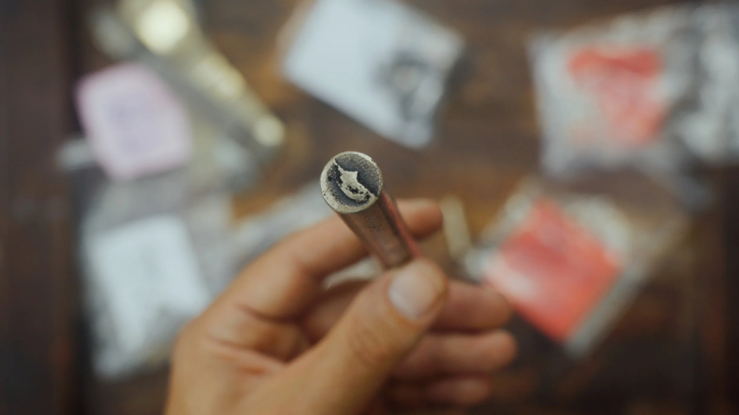 Together with jewelry artists Alvaro-Luca Ellwart and Nora Kovats from Studio Nonne 11 in Bamberg, we carefully disassembled the knives, cut them into pieces, and melted them down. Through a traditional sand-casting process, we created a raw blank from which I crafted the cap and grip section of the fountain pen.