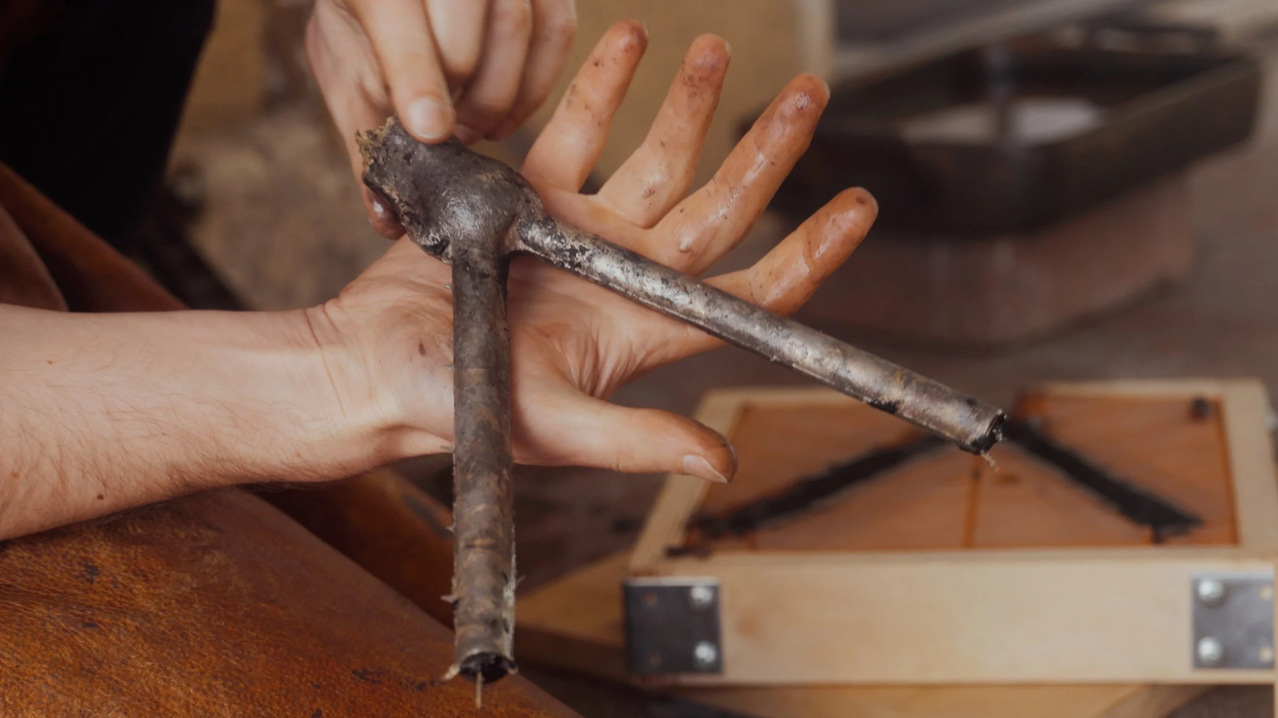 Mit Unterstützung zweier talentierter Schmuckkünstler des Studios Nonne 11 in Bamberg – Alvaro-Luca Ellwart und Nora Kowats – wurde der Sextant behutsam demontiert. Im klassischen Sandgussverfahren haben wir das historische Metall geschmolzen und neu geformt, um die Essenz der Vergangenheit in eine neue, greifbare Form zu überführen.