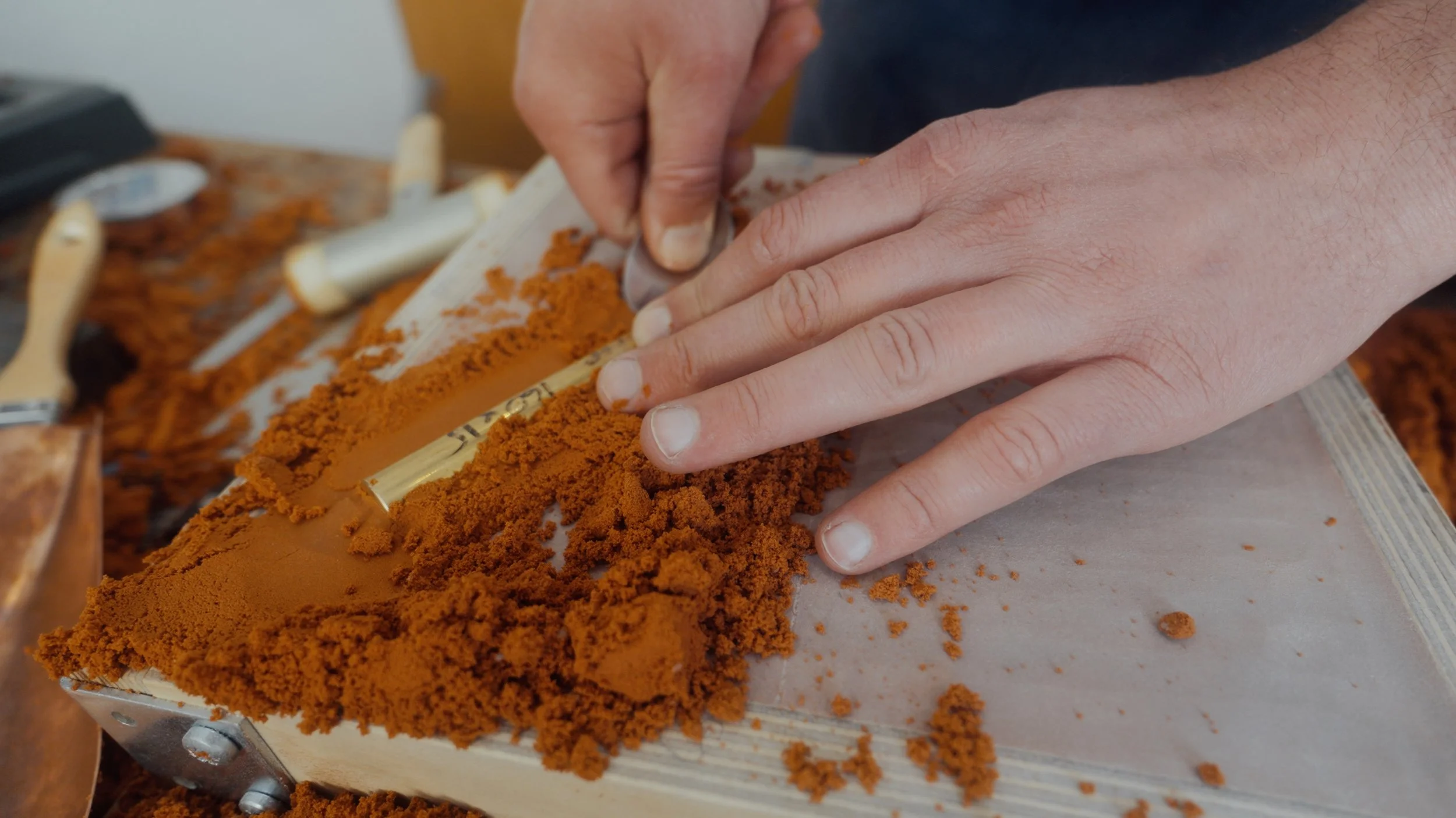 Anschließend wurde die Sandgussform vorbereitet und die kleinen Einzelteile des Sextanten eingeschmolzen. Die heiße Schmelze gab Alvaro in die Form – so entstand der Schaft eines neuen Füllfederhalters.