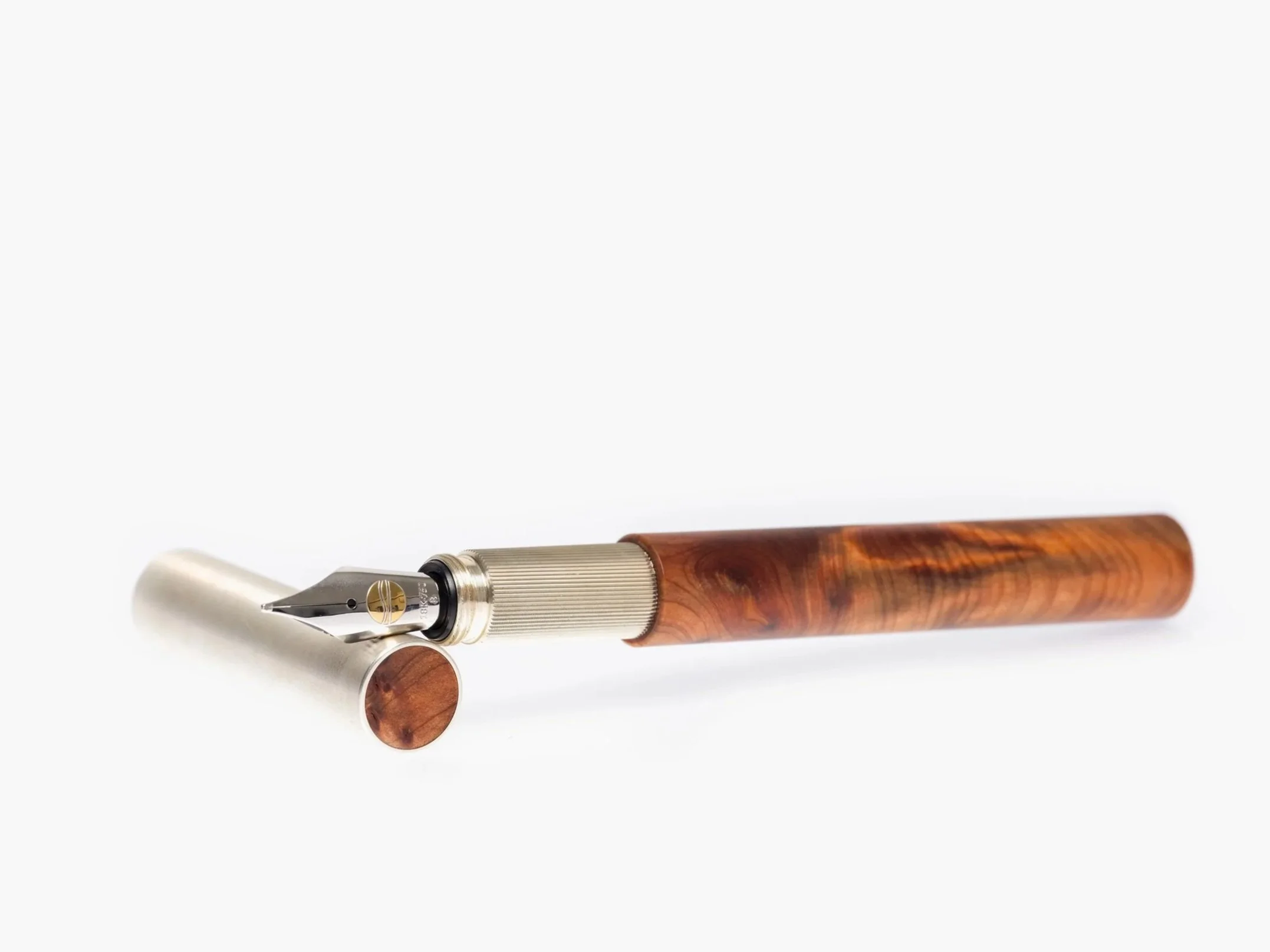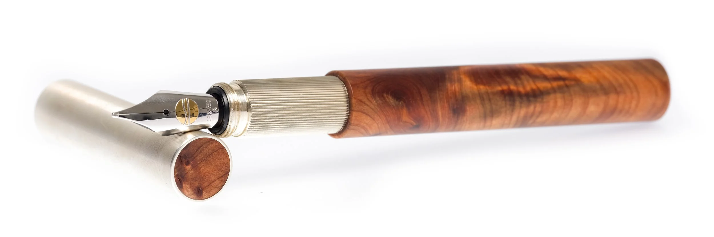 Für den Schaft wählte sie Thuja-Maser, das Holz des Lebensbaums – ein Symbol für Wachstum, Widerstandskraft und Erneuerung. Seine ausdrucksstarke Maserung erzählt von der Lebendigkeit der Natur, von Verwurzelung und Beständigkeit. Die Kappe und das Griffstück fertigte ich aus zeitlos schönem Silber – mit einem angenehmen, präsenten Gewicht, das Wertigkeit und Beständigkeit vermittelt.