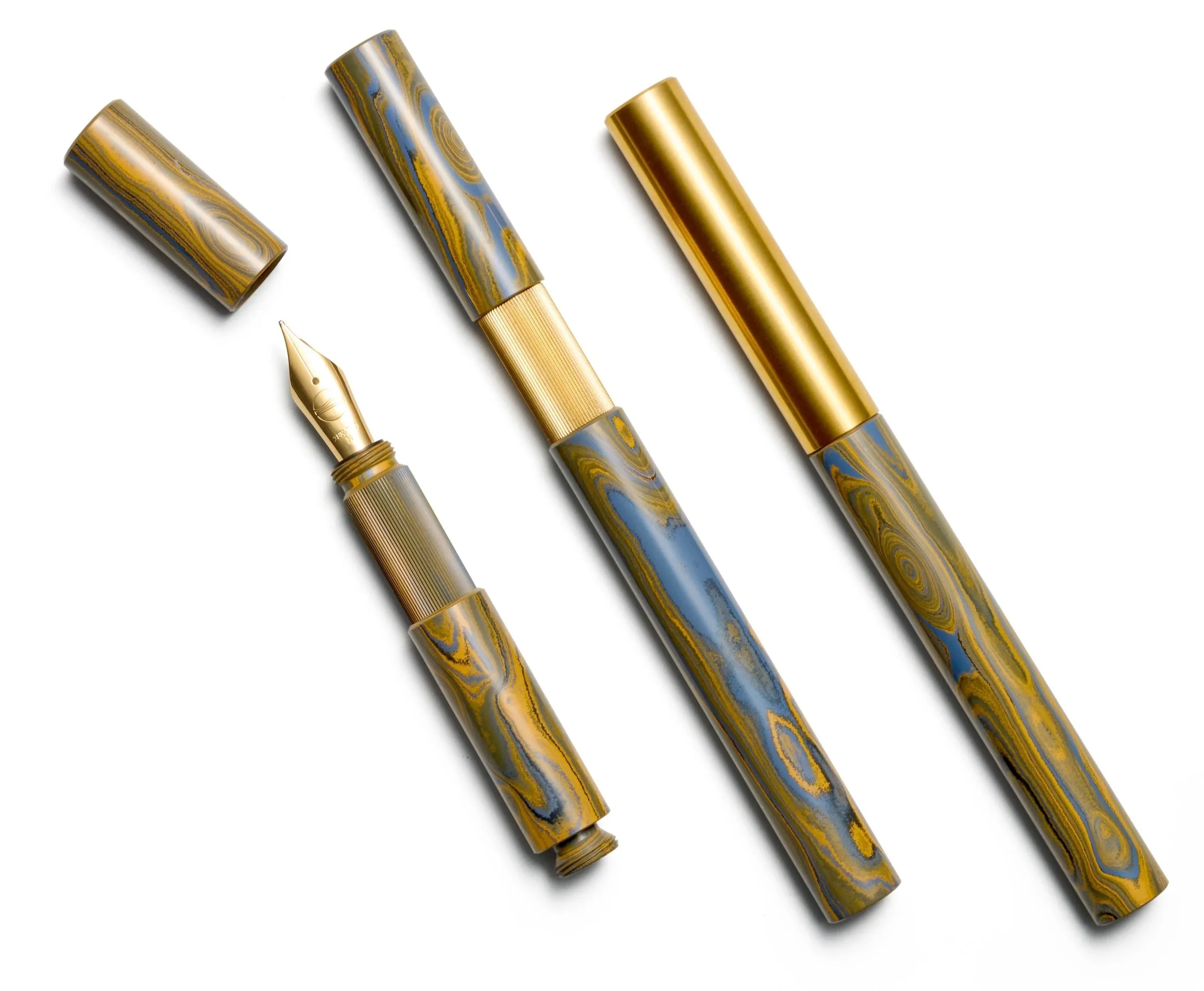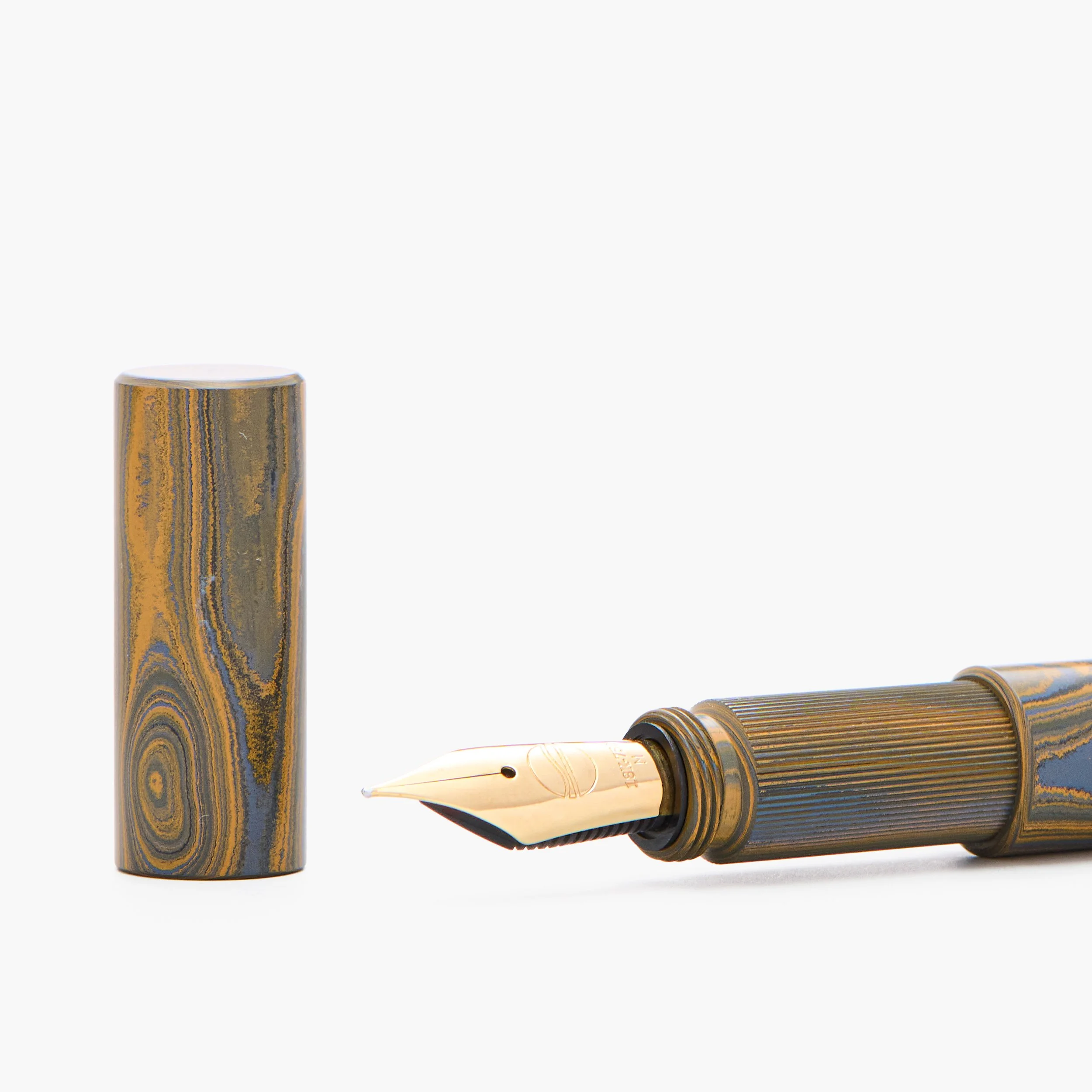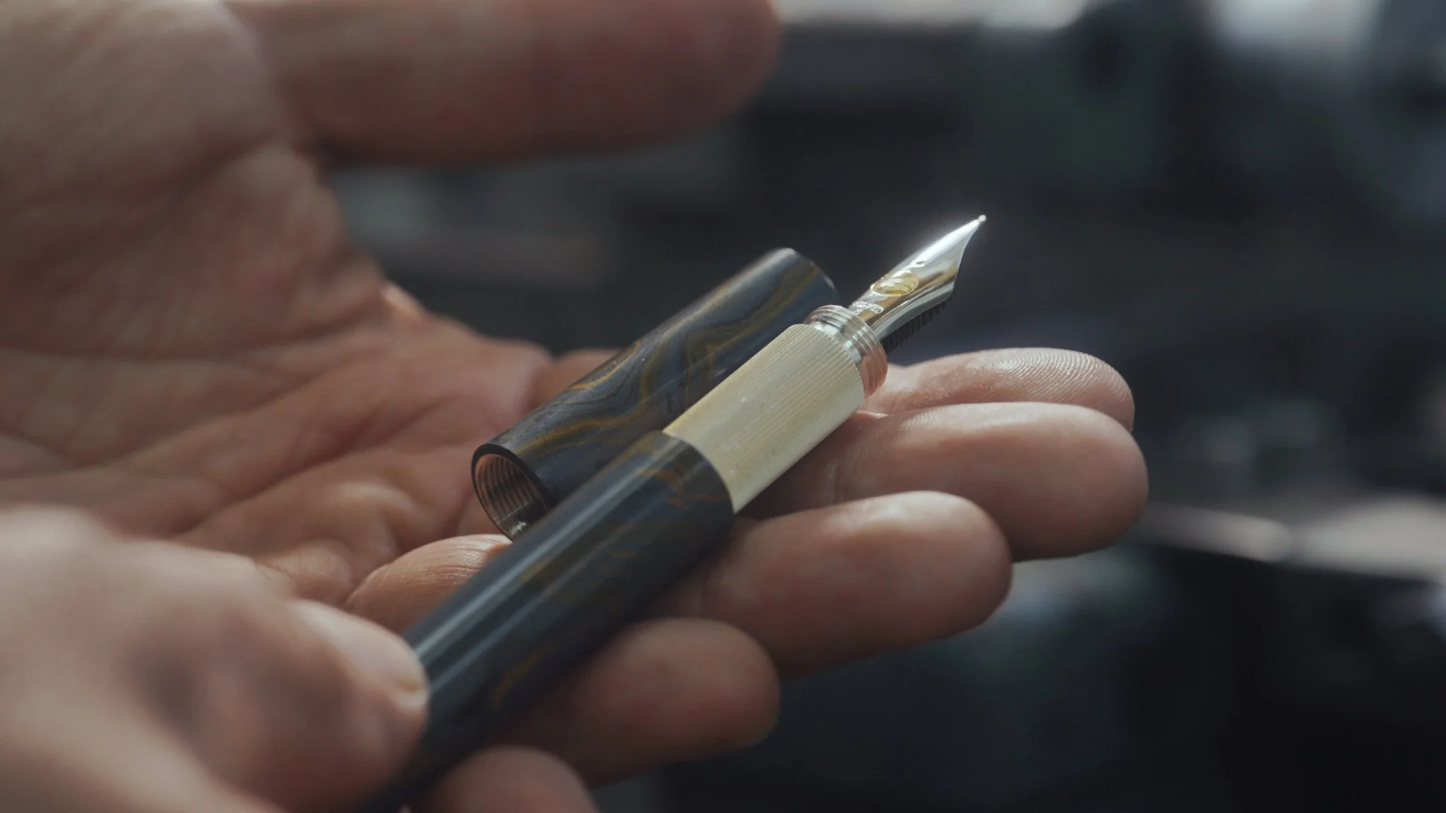 Nach einem intensiven Schleifprozess kommen die Farben, die Komposition und die einzigartige Textur – das Zusammenspiel der vermischten Töne – erst richtig zur Geltung. Ein letzter Aha-Moment, bevor ich das Ebonit in meiner Werkstatt zu einem Füllfederhalter weiterverarbeite.
