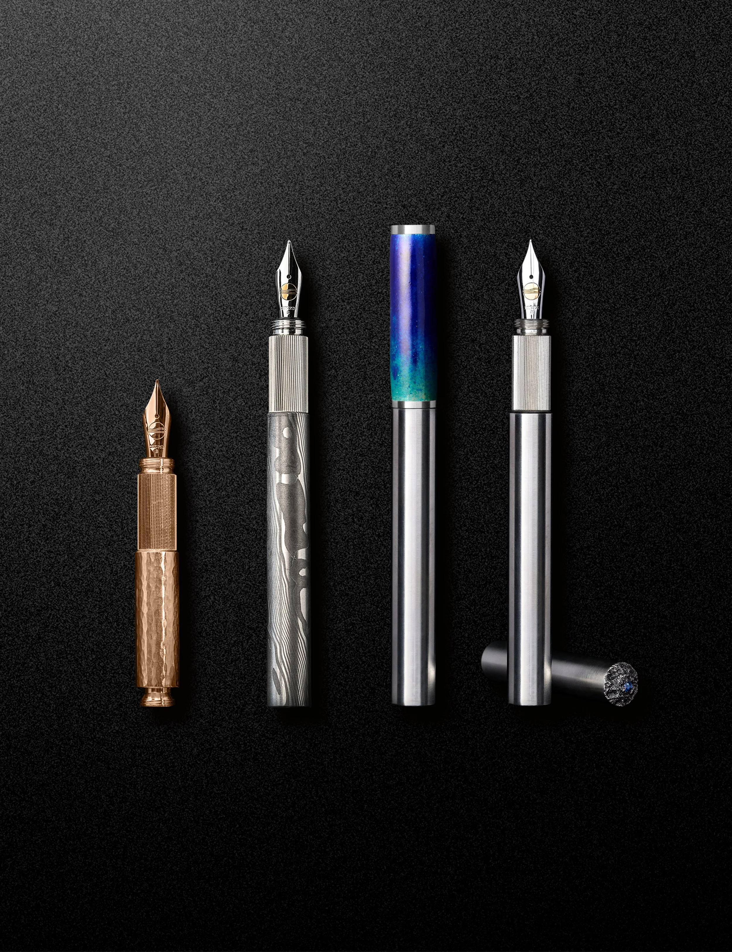 Im Zentrum stehen drei Modellfamilien: POCKETMASTER, SHORTCAP und LONGCAP. Auf dieser Formensprache bauen wir unsere THE NINE Core Kollektion, Sondereditionen, Preziosen und ausgewählte BESPOKE-Projekte auf. So bleibt die Gestaltung ruhig und wiedererkennbar, während Materialien, Oberflächen und Details variieren dürfen. Das Ergebnis sind Füllfederhalter, die leicht in die Hand finden und sich im Alltag wie ein vertrautes Werkzeug anfühlen – und gleichzeitig als hochwertiges Stück Kunsthandwerk betrachtet werden.